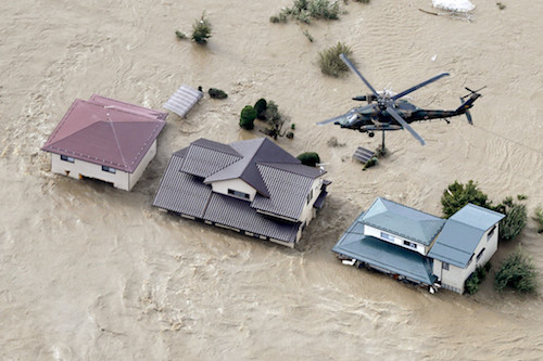 Người dân Nhật Bản mắc kẹt trong lũ. Nhật Bản nhanh chóng huy động hàng chục nghìn người, bao gồm binh sĩ và lực lượng khác, để giải cứu người dân. Dưới đây là hình ảnh được ghi lại.