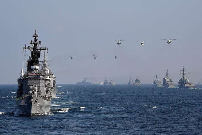 Các tàu chiến của Lực lượng Phòng vệ Hàng hải Nhật Bản duyệt đội hình ngoài khơi tỉnh Kanagawa vào năm 2015. Ảnh: AFP.