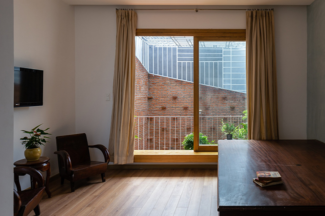 Mảnh sân này đóng vai trò như “trái tim” của cả công trình, vừa thông gió vừa giúp phòng khách và các phòng ngủ luôn có ánh sáng tự nhiên.