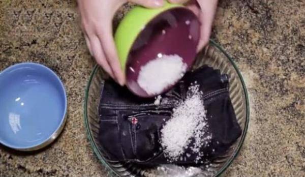 Cách làm rất đơn gi*ản. Hãy chuẩn bị một bát muối. Sau đó cho muối vào chậu hòa tan cùng với một ít nước rồi thả quần jean vào ngâm vài tiếng. Muối góp phần làm ổn định màu của vải, do vậy chiếc quần sẽ lâu phai màu hơn.