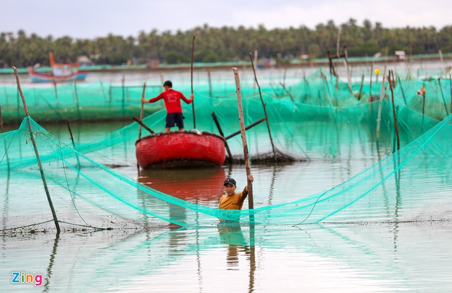 Ngư dân Trần Quang Hải (ngụ thôn 1, xã Xuân Hải) buộc lại lưới sau bão. "Gia đình thả khoảng 6.000 con cá mú xuống ao nuôi. Sau 8 tháng nuôi, mỗi con nặng hơn 0,6 kg, chúng tôi dự kiến đến Tết Nguyên Đán thu hoạch, bán cho thương lái với giá khoảng 220.000 đồng mỗi kg. Tuy nhiên cơn bão bất ngờ ập tới, sóng biển dâng cao cuốn trôi đi sạch, giờ thì trắng tay rồi", ông Hải mếu máo nói.