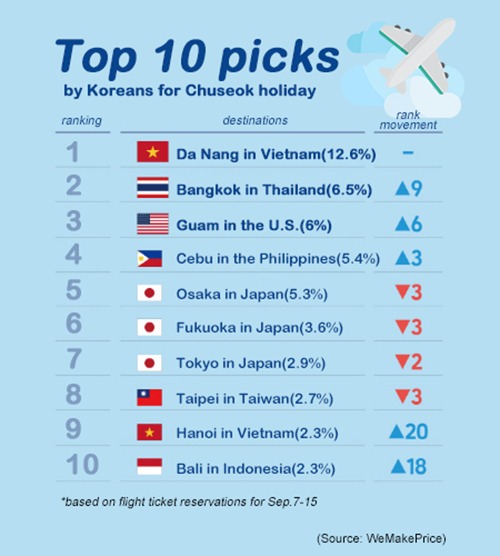 Hà Nội là điểm đến có khách Hàn Quốc mua vé tăng nhanh nhất dịp lễ Chuseok năm 2019. Đồ hoạ: WeMakePrice.