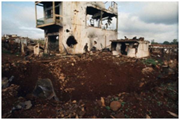 [Hai bức hình trên cho chúng ta thấy rõ đạn pháo binh 130 ly của cộng quân tàn phá đến mức nào? Không thể do bom Mỹ được vì sức tàn phá của bom mạnh hơn rất nhiều, sẽ không có mảnh tường nào đứng vững được nếu bị ăn bom. Hình bên trái: Toà Hành chính Tỉnh Bình Long. Hình bên phải: "Giải phóng là như thế này đây" có khác gì chuyện cướp đất của đồng bào Thủ Thiêm, hay vườn rau Lộc Hưng hôm nay?] (Hình ảnh: Bruno Barbey.)