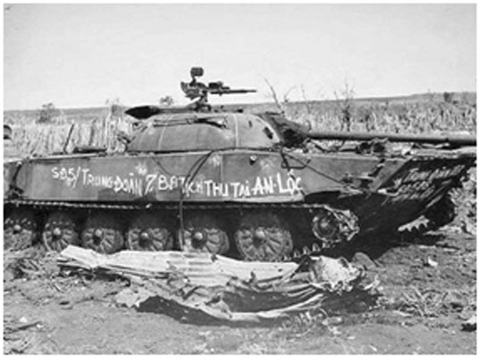 [Theo tài liệu tổng số xe thiết giáp đủ loại của cộng quân bị hạ tại An Lộc do các binh chủng Quân Lực VNCH bắn bằng súng M 72, hoặc do phi cơ AC-130 Specter và B 52 là 45 chiếc. Khi CSVN vào chiếm Dinh Độc Lập ngày 30/4/1975, không hề gập một chống đối, nhưng sau đó dàn cảnh cho quay phim một chiếc xe thiết giáp húc đổ cánh cửa dinh. VNCH không có thói quen đóng phim tuyên truyền bịp bợm, rẻ tiền như thế!] (Hình ảnh: Bruno Barbey.)