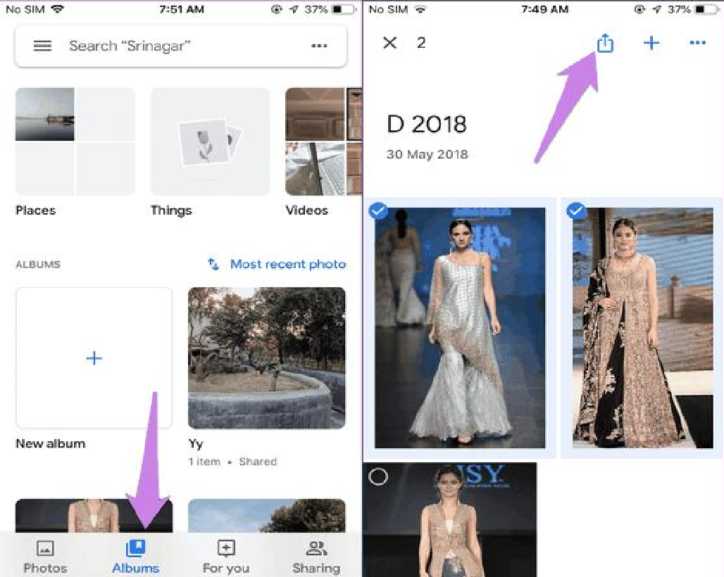 - Bước 2: Tiếp theo, người dùng chỉ cần chuyển sang mục Album, nhấn và giữ để chọn các album ảnh cần tải về. Sau đó, bấm vào biểu tượng nút Share (chia sẻ) ở góc trên và chọn Save Images (lưu hình ảnh).
