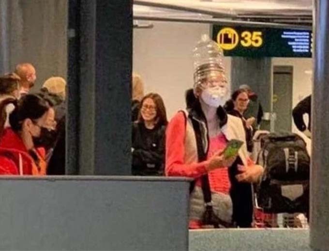 Người phụ nữ này trùm túi nylon lên đầu tại sân bay. Ảnh: Twitter.