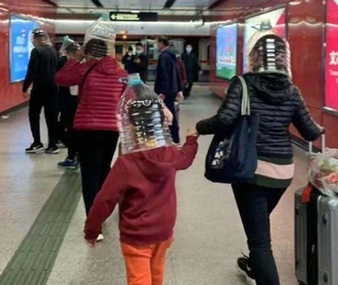 Một bức ảnh chụp bà mẹ và đứa con đi tàu điện ngầm Hong Kong đội chai nhựa. Trong khi đó nhiều hành khách cũng sử dụng biện pháp bảo vệ tương tự khi đứng chờ ở các sân bay. Ảnh: Twitter.
