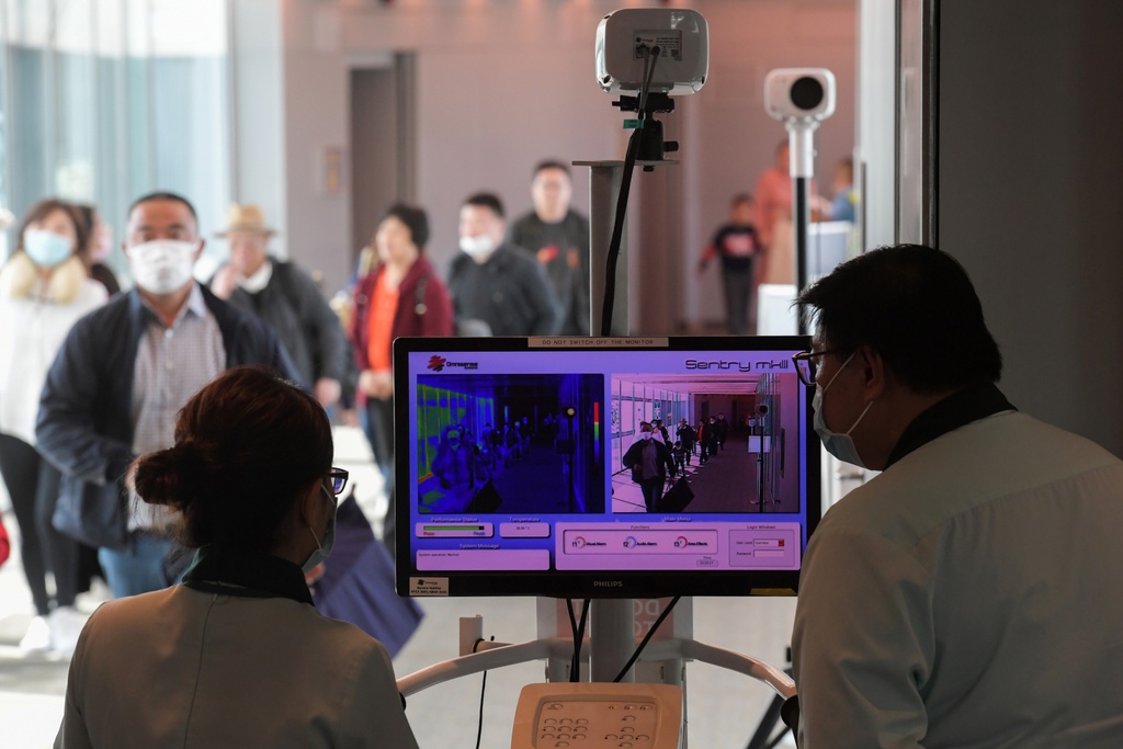 Nhân viên y tế ở sân bay quốc tế Changi của Singapore theo dơi thân nhiệt hành khách. Ảnh: AFP.Cuộc gặp đưa virus corona đi khắp thế giới