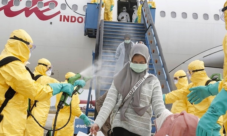 Người Indonesia sơ tán từ Vũ Hán được khử trùng khi đến đảo Natuna hôm 2/2. Ảnh: Reuters.