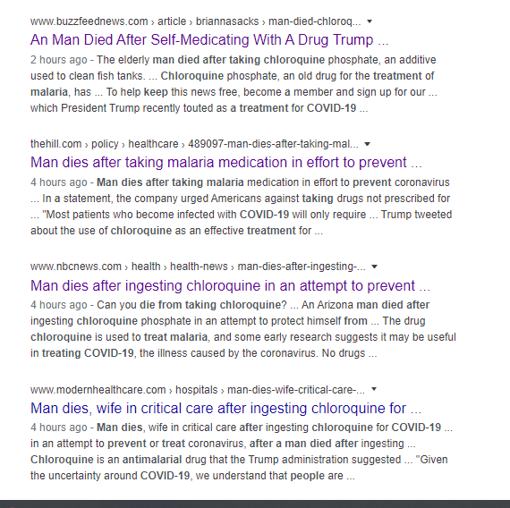 Theo thông cáo báo chí từ Banner Health có trụ sở ở Arizona, hai vợ chồng ở độ tuổi trên 60 đã uống chloroquine phosphate được sử dụng vệ sinh hồ cá để chống virus corona. Chỉ trong vòng nửa tiếng đồng hồ sau, cả hai được đưa vào phòng cấp cứu, và người chồng qua đời sau đó.