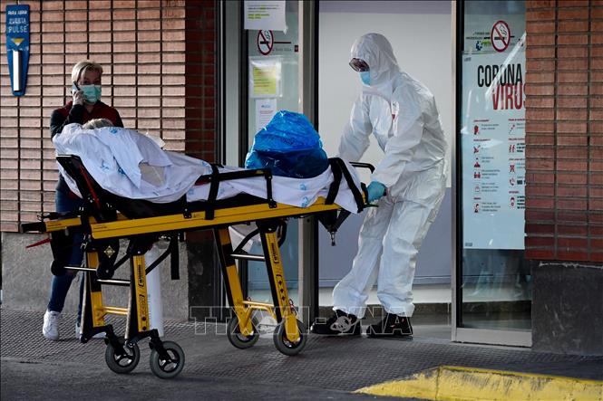 Nhân viên y tế chuyển bệnh nhân nhiễm COVID-19 tới bệnh viện Severo Ochoa ở Leganes (Tây Ban Nha) ngày 26/3/2020. Ảnh: AFP/TTXVN