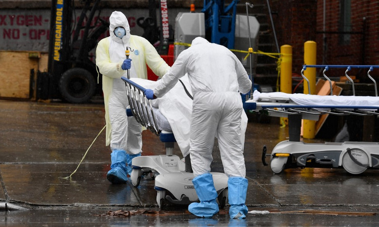 Nhân viên y tế Mỹ đưa thi thể bệnh nhân ra xe đông lạnh tại New York hôm 9/4. Ảnh: AFP.