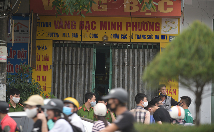 Cảnh sát phong toả hiệu vàng ở số 50 Quang Trung khám nghiệm hiện trường chiều 20/4.