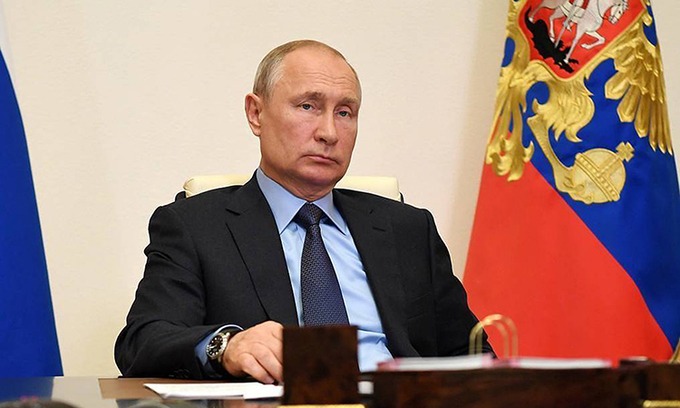 Tổng thống Nga Vladimir Putin trong cuộc họp trực tuyến với các quan chức tại dinh thự ở Novo-Ogaryovo, ngày 14/5. Ảnh:Điện Kremlin.