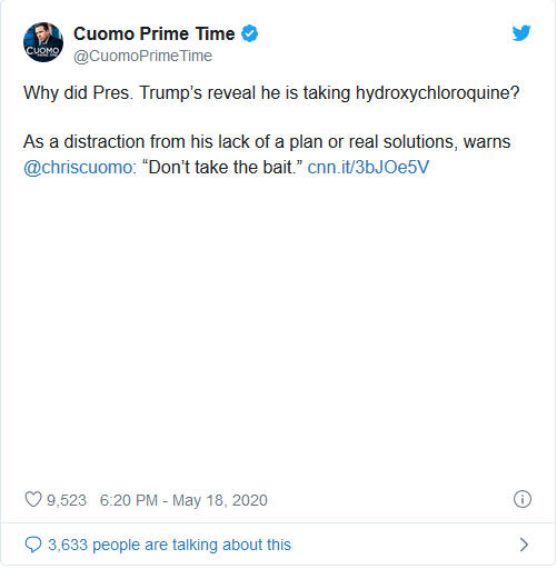 Cuomo also said during the opening of his low rated show, “the president knows that Hydroxychloroquine is not supported by science. He knows it has been flagged by people in his own administration” and called it a distraction from “his lack of a plan or real solutions.”