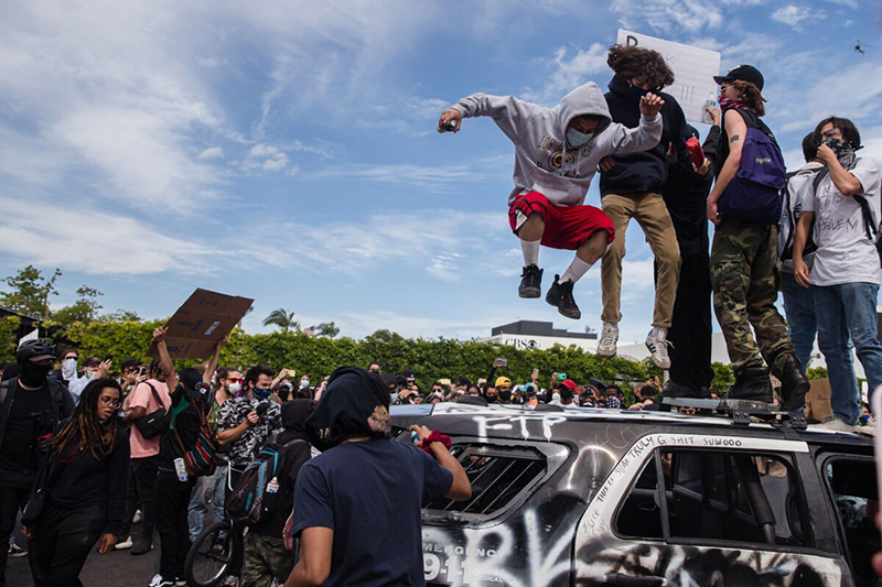 Những người bạo loạn nhảy lên một chiếc xe cảnh sát bị hư hỏng ở Los Angeles. (Ảnh qua Getty Images)