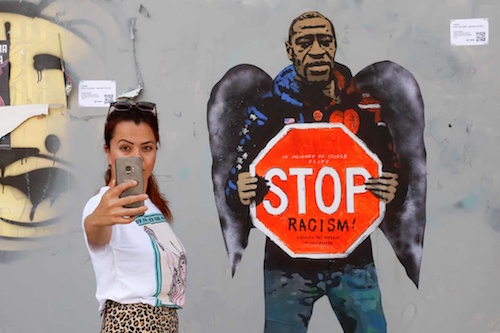 George Floyd hiện lên với đôi cảnh thiên thần, áo choàng mang màu cờ Mỹ và tấm biển "Stop Racism" - Chấm dứt phân biệt chủng tộc. Tác phẩm được thực hiện ở Barcelona, Tây Ban Nha. Ảnh: AFP.