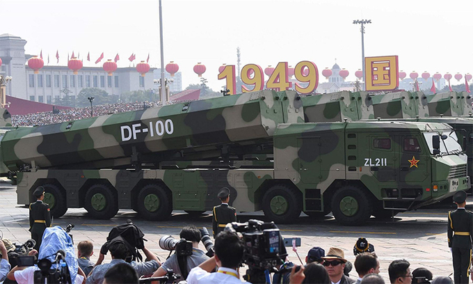 Tên lửa hành trình DF-100 với tầm bắn 650 km trong lễ duyệt binh kỷ niệm 70 năm quốc khành Trung Quốc tháng 10/2019. Ảnh: AFP.
