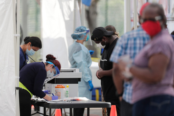 Các nhân viên y tế đang ghi tên những người tới làm xét nghiệm COVID-19 tại Miami trong tháng 5-2020 - Ảnh: AP