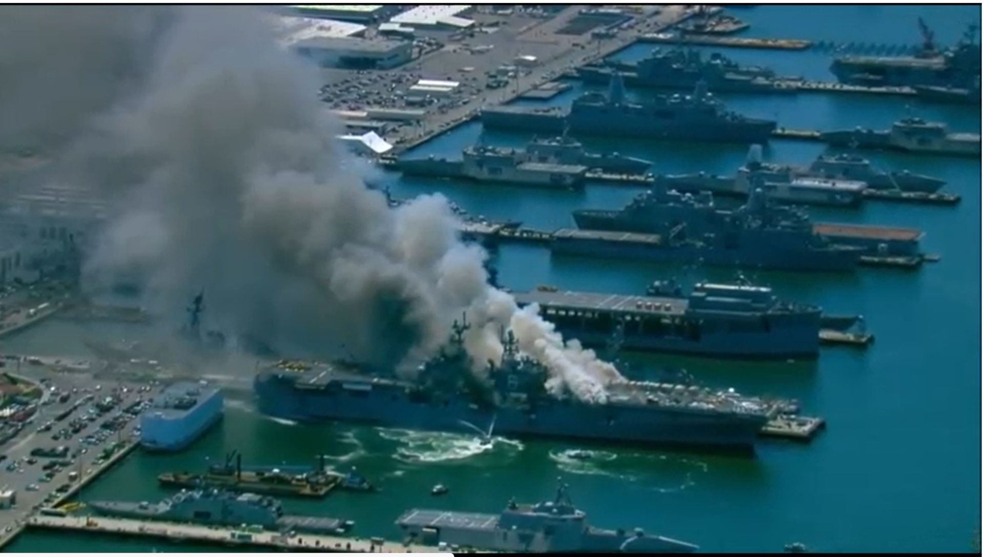 Tàu cứu hỏa cũng được huy động để dập tắt đám cháy trên chiếc USS Bonhomme Richard. (Hình: NBC7 San Diego)