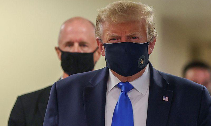 Tổng thống Donald Trump lần đầu đeo khẩu trang khi tới thăm Trung tâm Y tế Quân đội Quốc gia Walter Reed ở Bethesda, bang Maryland, ngày 11/7. Ảnh: Reuters.