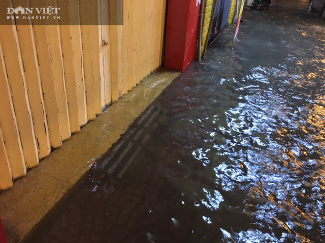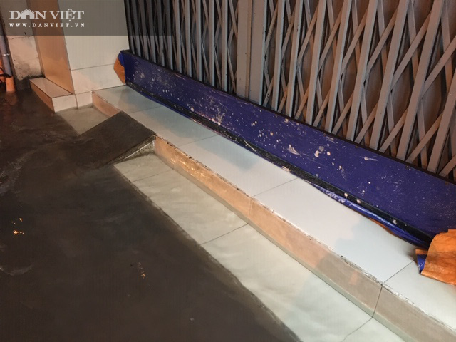 Mưa tràn qua vỉa hè vào trong nhà dân.