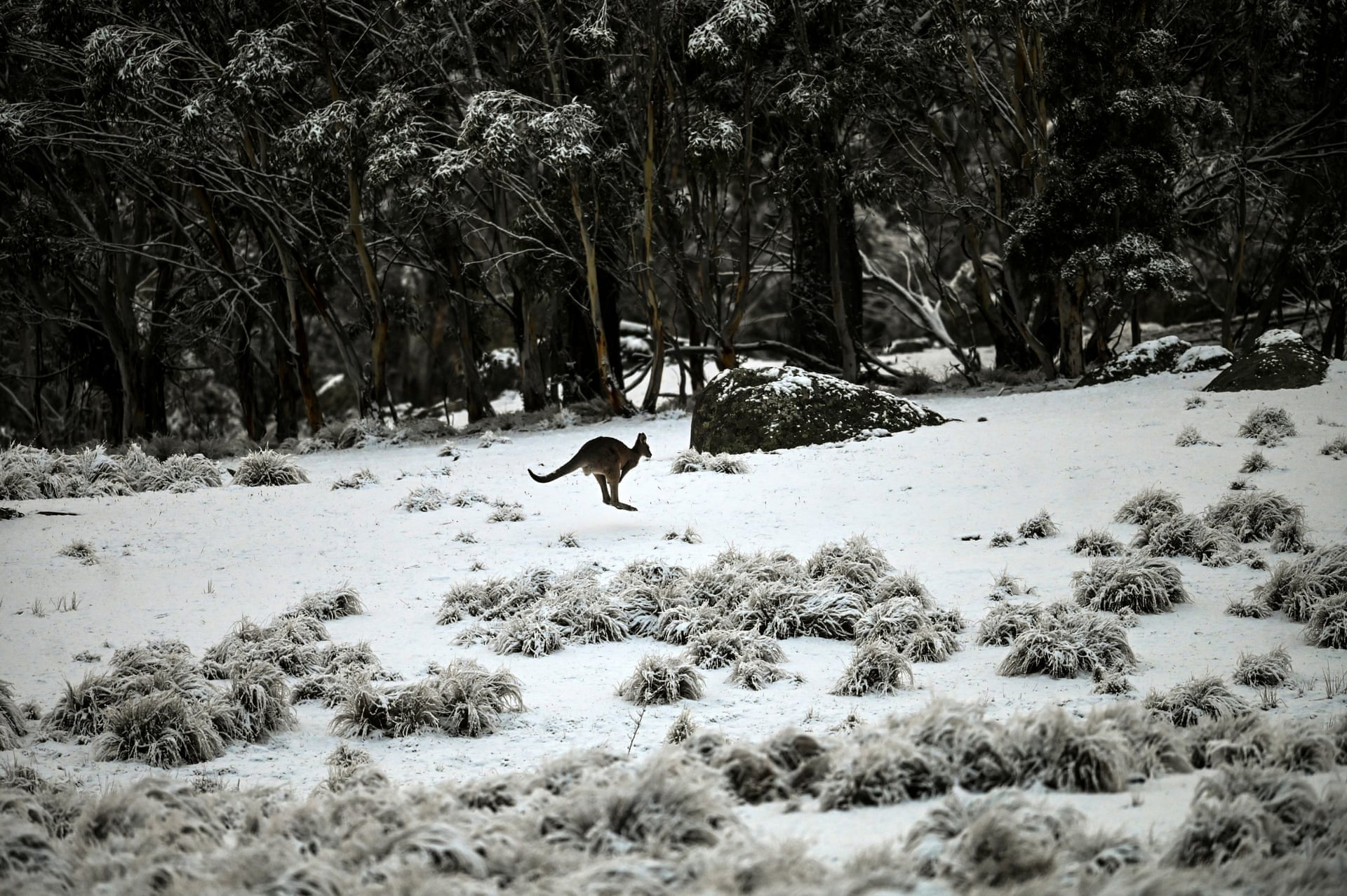 Một con kangaroo nhảy trên nền tuyết trắng tại vườn quốc gia Wadbilliga, gần Nimmitabel, Úc. Tác giả: Lukas Coch.