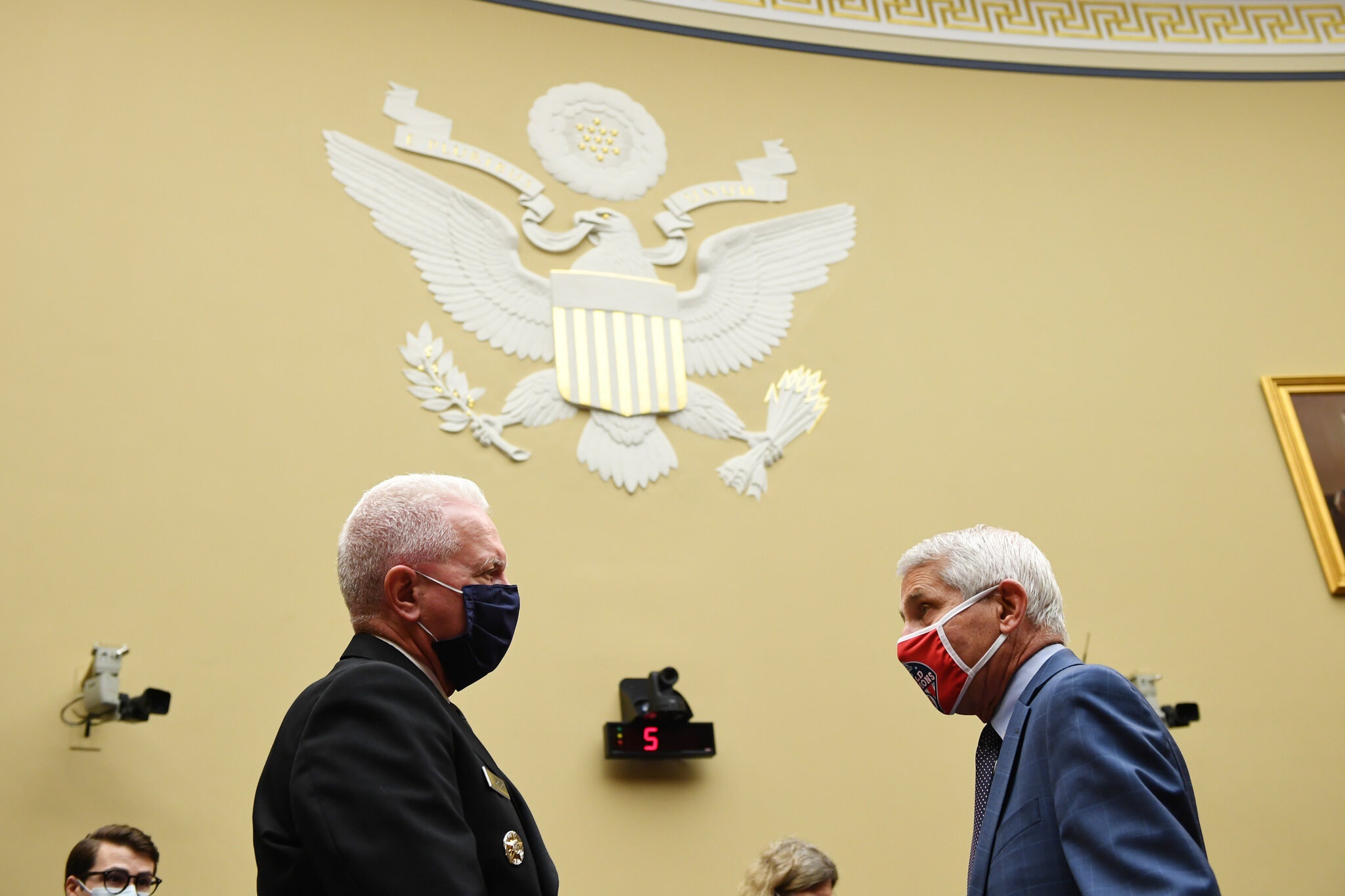 Brett Giroir (trái), quan chức liên bang phụ trách việc xét nghiệm virus corona tại Mỹ, trò chuyện với Anthony Fauci, Giám đốc Viện Dị ứng và Bệnh truyền Nhiễm Quốc gia Mỹ, trong cuộc điều trần tại Hạ viện hồi tháng 7. Ảnh: New York Times.