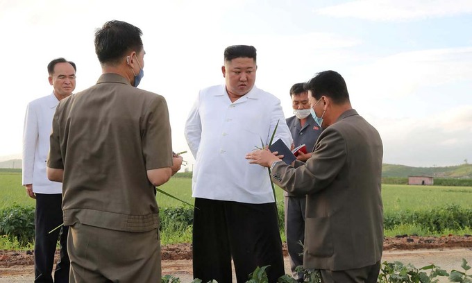 Lãnh đạo Triều Tiên Kim Jong-un (giữa) thị sát khu vực chịu thiệt hại do bão ở tỉnh Nam Hwanghae trong bức ảnh công bố hôm 27/8. Ảnh: KCNA.