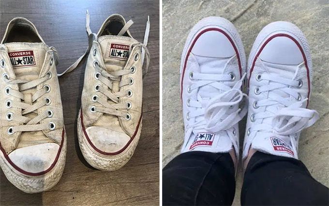Đôi giày Converse trắng tinh sau khi được ngâm cùng chất làm sạch giá rẻ.