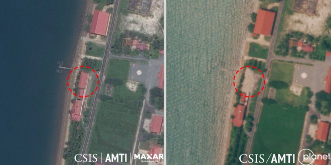 So sánh hình chụp vệ tinh ngày 22.8 (trái) và ngày 1.10 (phải) thì một cơ sở do Mỹ xây dựng ở Ream đã bị phá dỡ.