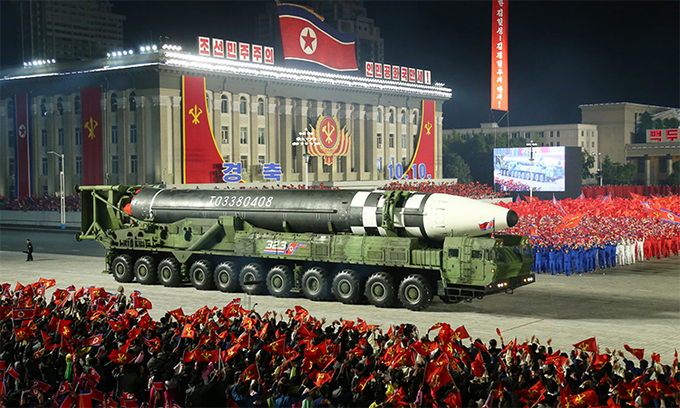 Triều Tiên công bố một loạt khí tài hiện đại mới trong lễ duyệt binh, từ vũ khí bộ binh, mặt nạ phòng độc dùng trong chiến tranh hóa học cho đến tên lửa đạn đạo phóng từ tàu ngầm. Nhưng mọi sự chú ý đổ dồn vào mẫu ICBM mới, chưa từng xuất hiện trước đây, được chở trên xe tải kiêm bệ phóng có tới 11 cặp bánh lốp. Mẫu tên lửa này được cho là có kích thước lớn hơn Hwasong-15, ICBM uy lực nhất Triều Tiên từng công bố trước đó, được chở trên xe tải có 9 cặp bánh lốp.