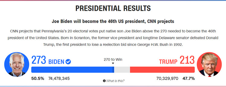 Joe Biden wins Pennsylvania and the presidency, securing more than 270 electoral votes