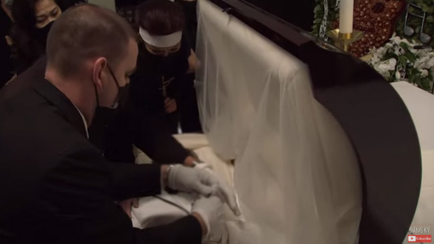 Trước khi quan tài đóng nắp, ca sĩ Phương Loan đã đứng bên cạnh lẳng lặng theo dõi, đôi mắt lộ rõ vẻ u buồn. Khi quan tài sắp đóng lại, cô đã đưa tay ra vỗ về linh cữu của chồng, nhẹ nhàng đặt lên trái tim cố nghệ sĩ rồi chạm vào đôi bàn tay đang ôm chặt kỷ vật của chồng lần cuối. Khoảnh khắc này ngay lập tức khiến nhiều người vô cùng xúc động và xót xa.