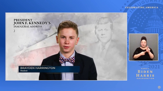 Cậu bé nói lắp gây chú ý trong ngày ông Joe Biden nhậm chức. Brayden Harrington (13 tuổi), từng phát biểu tại Đại hội Toàn quốc đảng Dân chủ, tiếp tục được mời tham gia chương trình đặc biệt chào mừng buổi lễ nhậm chức của ông Joe Biden.