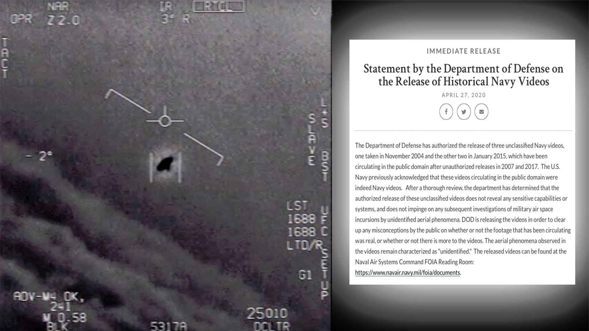 Trước đó, ngày 27/4/2020, Lầu Năm Góc công bố phát hành chính thức bộ 3 video, thường được biết đến với tên tệp "FLIR", "GO FAST" và "GIMBAL", vốn là những thông tin gây chú ý tại nước này trong nhiều năm qua. Bộ Quốc phòng Hoa Kỳ xác đinh các video chưa được phân loại, trong đó một video được quay vào tháng 11/2004, hai video còn lại quay vào tháng 1/2015 và đã được lưu hành rộng rãi sau khi bị phát hành trái phép vào năm 2007 và 2017.