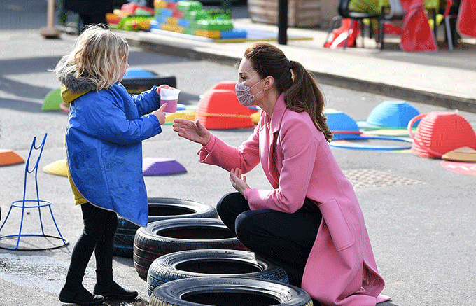 Nữ công tước xứ Cambridge chơi đùa và hỏi thăm trẻ em ở trường học London hôm 11/3. Ảnh: AFP.