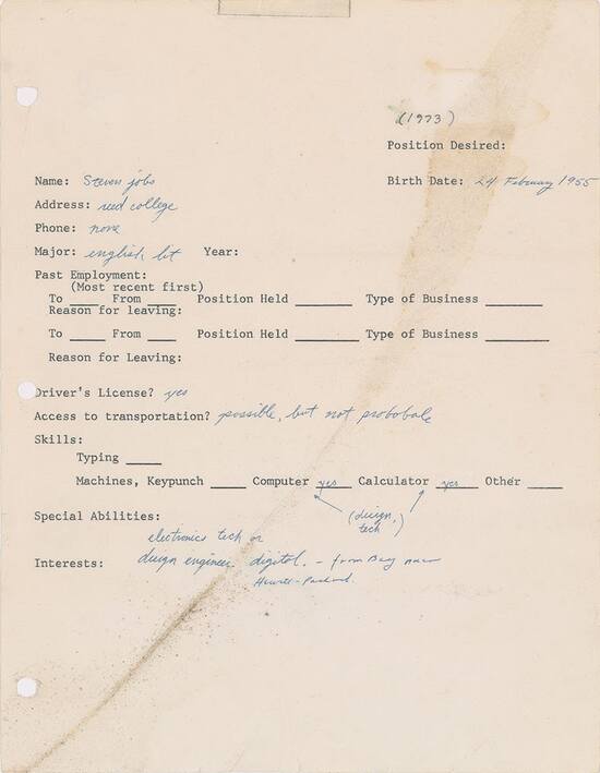 Đơn xin việc viết tay của Steve Jobs vào năm 1973.