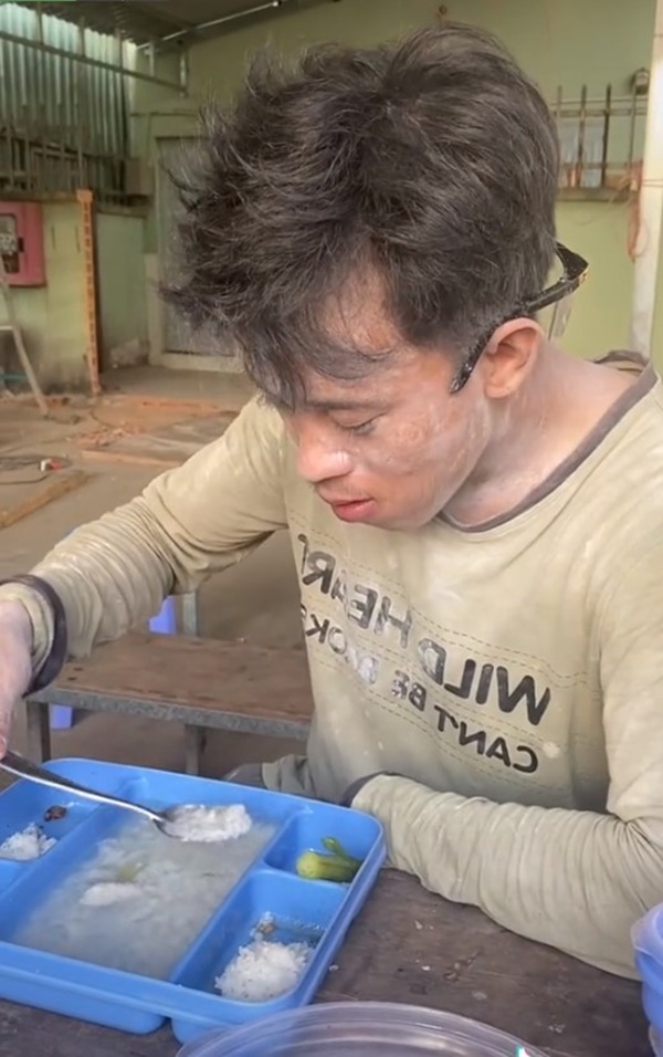 Ở đoạn clip chàng trai người đầy bụi bặm đang bê khay cơm trắng chan nước lõng bõng, ô bên cạnh còn sót lại 1 quả đậu bắp luộc. Khay cơm đạm bạc như vậy nhưng chàng trai này ăn vô cùng ngon lành, có chăng là ăn để lấy sức làm việc nặng nhọc.