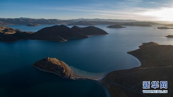 Chỉ có một dải đất hẹp dẫn từ bờ hồ Yamdrok đến ngôi chùa.