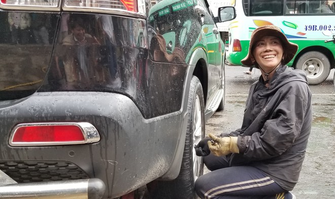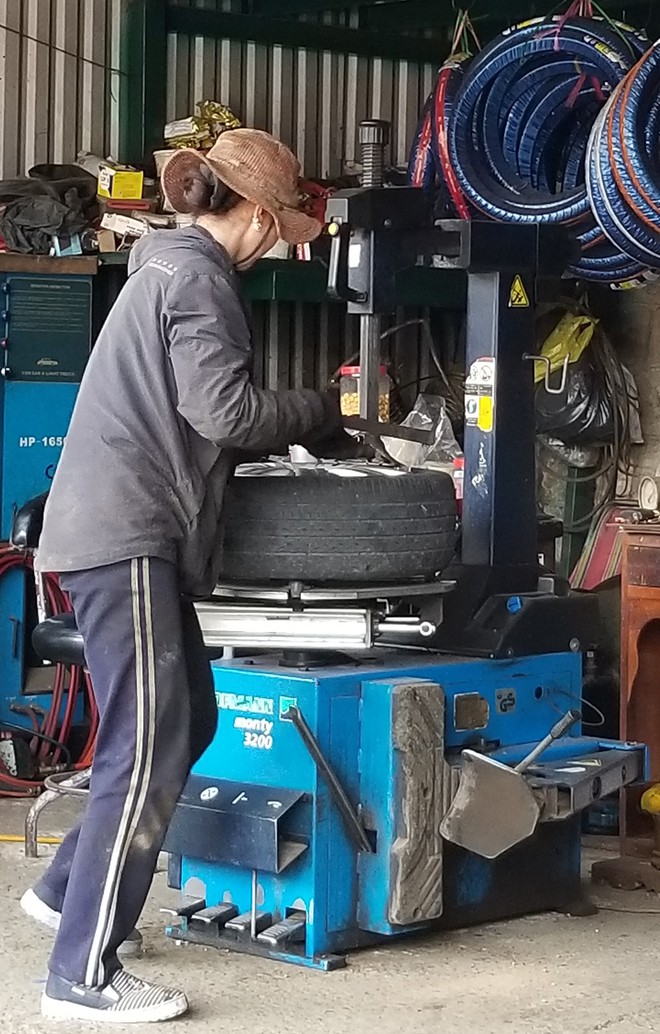 Chiếc ô tô 7 chỗ vừa tấp vào, bà liền hỏi “bánh bên tài hay bên phụ, trước hay sau” và cầm ngay con đội để kích gầm xe lên, rồi nhanh tay cầm chiếc súng hơi bắn bu lông tháo ốc vít. Bánh xe được lăn nhanh vào cửa hàng, bằng đôi tay mảnh mai nhưng bà Minh đưa lên bàn chuyên dụng với thao tác nhẹ nhàng, dứt khoát để xì hết hơi.