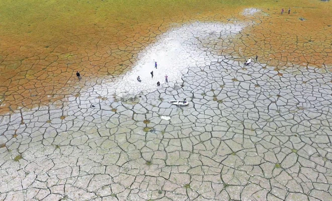 Đáy hồ khô của Sun Moon Lake ở quận Nantou, miền trung Đài Loan vào ngày 23/4. Ảnh: AP