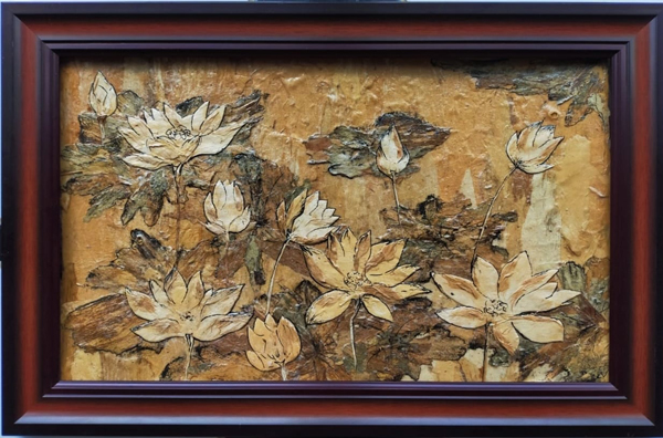 Với quan điểm “không có thứ gì là bỏ đi”, anh Nhân tiếp tục tận dụng những bẹ chuối khô để làm ra tranh vào khoảng năm 2019. “Bẹ chuối làm tranh bắt buộc phải là loại đã khô trên thân, không thể lấy loại tươi như vỏ tràm. Loại tranh này ngay khi gửi đi triển lãm tranh ở Hà Nội, có đối tác đặt mua ngay 50 bức để bán sang nước ngoài”, anh cho hay.
