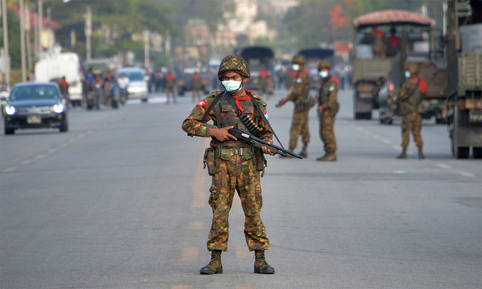 Binh sĩ Myanmar đứng gác tại một chốt kiểm soát an ninh ở thủ đô Naypyidaw ngày 17/2. Ảnh: AFP.