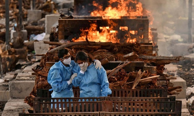 Gia đình một bệnh nhân tử vong vì Covid-19 tại nơi hỏa táng ở ngoại ô thành phố Bengaluru, Ấn Độ, hôm 13/5