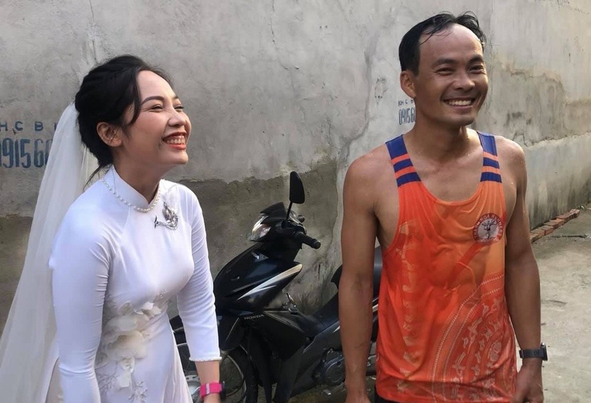 Không diện vest, đeo cà vạt, chú rể mặc chiếc áo 3 lỗ màu cam, xỏ đôi giày thể thao quen thuộc, chuẩn bị cho đường chạy không phải dài nhất nhưng là quan trọng nhất đời mình.