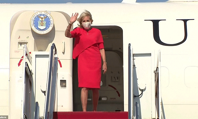 Đệ nhất phu nhân Mỹ Jill Biden đeo khẩu trang trắng, vẫy tay chào khi bước xuống từ chuyên cơ tại căn cứ không quân Yokota, phía tây Tokyo, Nhật Bản chiều 22/7, khi bà Jill Biden là người dẫn đầu phái đoàn ngoại giao Mỹ dự khai mạc Olympic Tokyo 2020, vừa đáp máy bay xuống Nhật Bản vào buổi chiều.