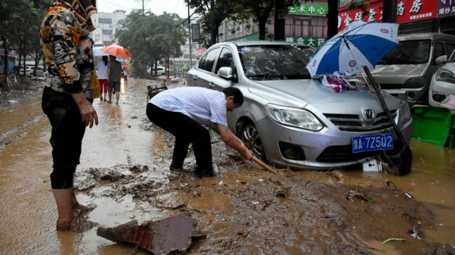 Tại TP Trịnh Châu, tỉnh Hà Nam - Trung Quốc, cư dân địa phương bắt đầu dọn dẹp bùn đất, kéo những chiếc xe bị mắc kẹt và giải phóng đồ đạc bị lũ lụt phá huỷ hôm 22-7. Trịnh Châu là một trong những khu vực bị ảnh hưởng bởi lũ lụt nặng nề nhất với ít nhất 33 người thiệt mạng tại thành phố này và các vùng lân cận.