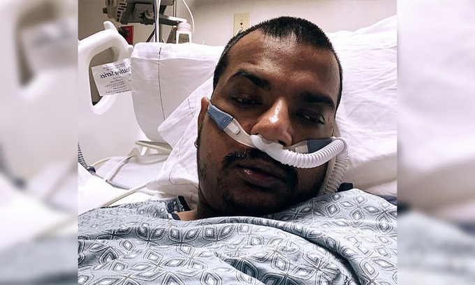 Stephen Harmon nằm trên giường bệnh và đeo ống thở sau khi nhiễm nCoV. Ảnh: NYDailynews.