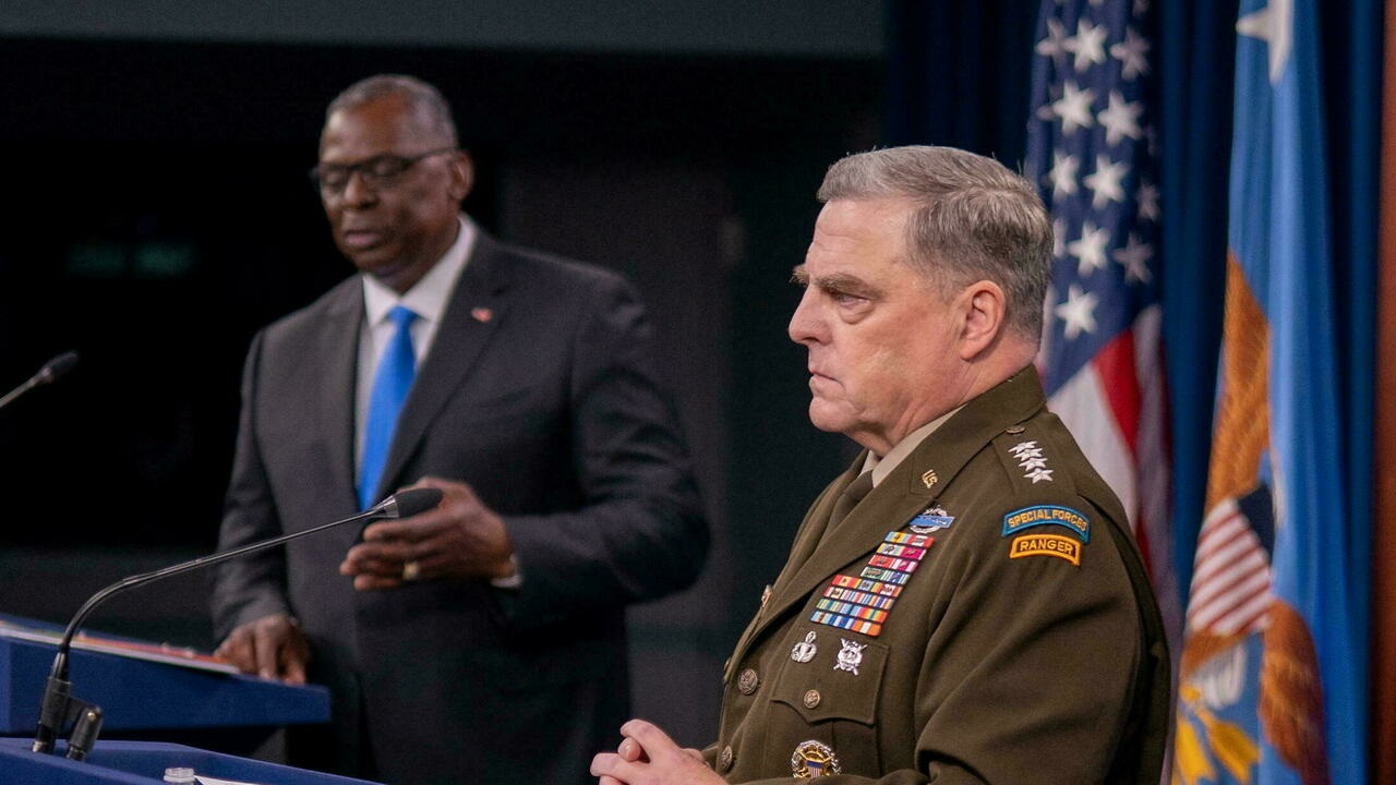 Tướng Mark Milley, tham mưu trưởng quân đội Hoa Kỳ (P) nghe bộ trưởng Quốc Phòng Mỹ Lloyd Austin trả lời các câu hỏi của nhà báo, tại Lầu Năm Góc, Arlington, Virginia, Mỹ, ngày 21/07/2021. REUTERS - KEN CEDENO